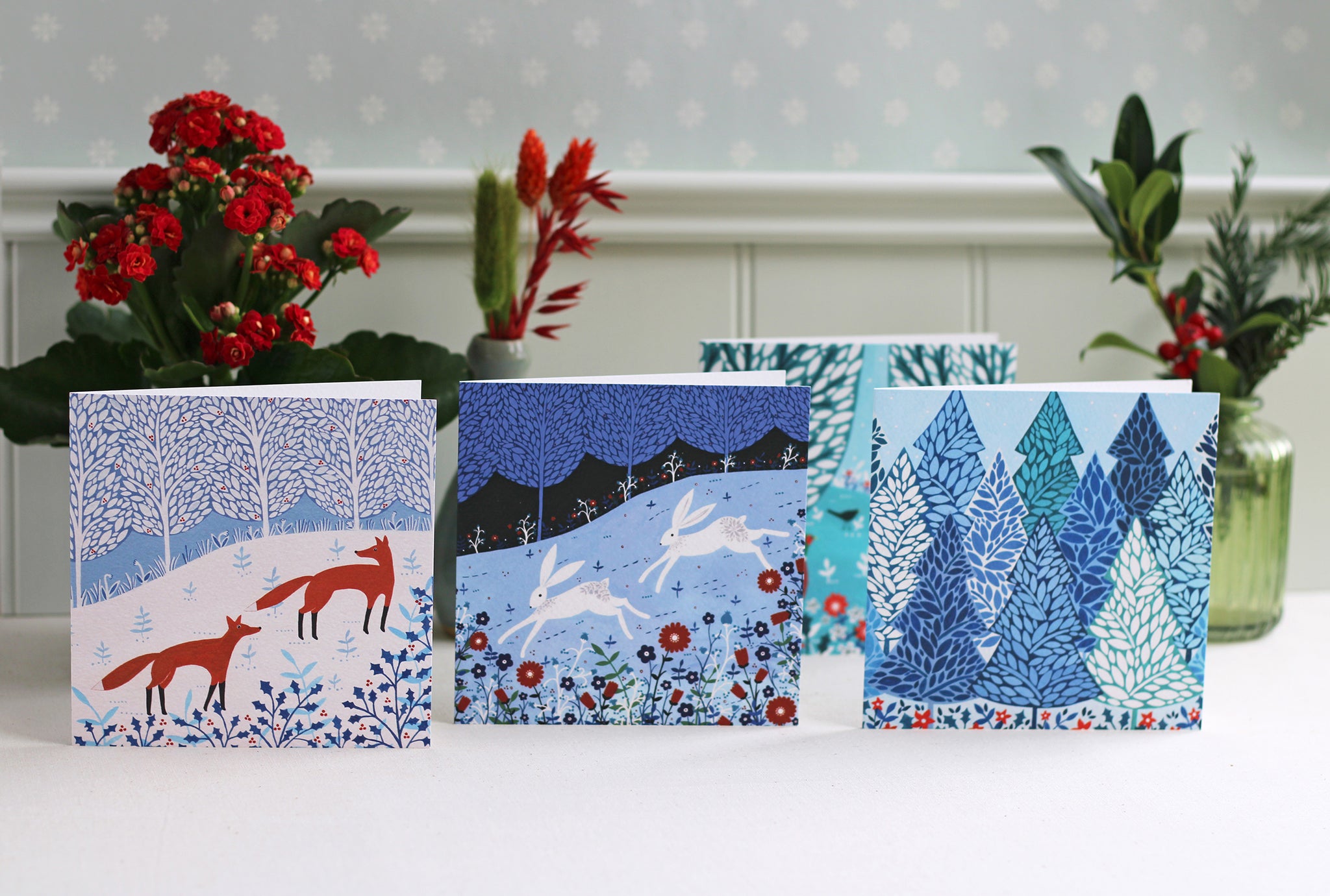 - Designs included are 'Winter Foxes', 'Winter Hares', 'Festive Pheasants' and 'Winter Trees'.