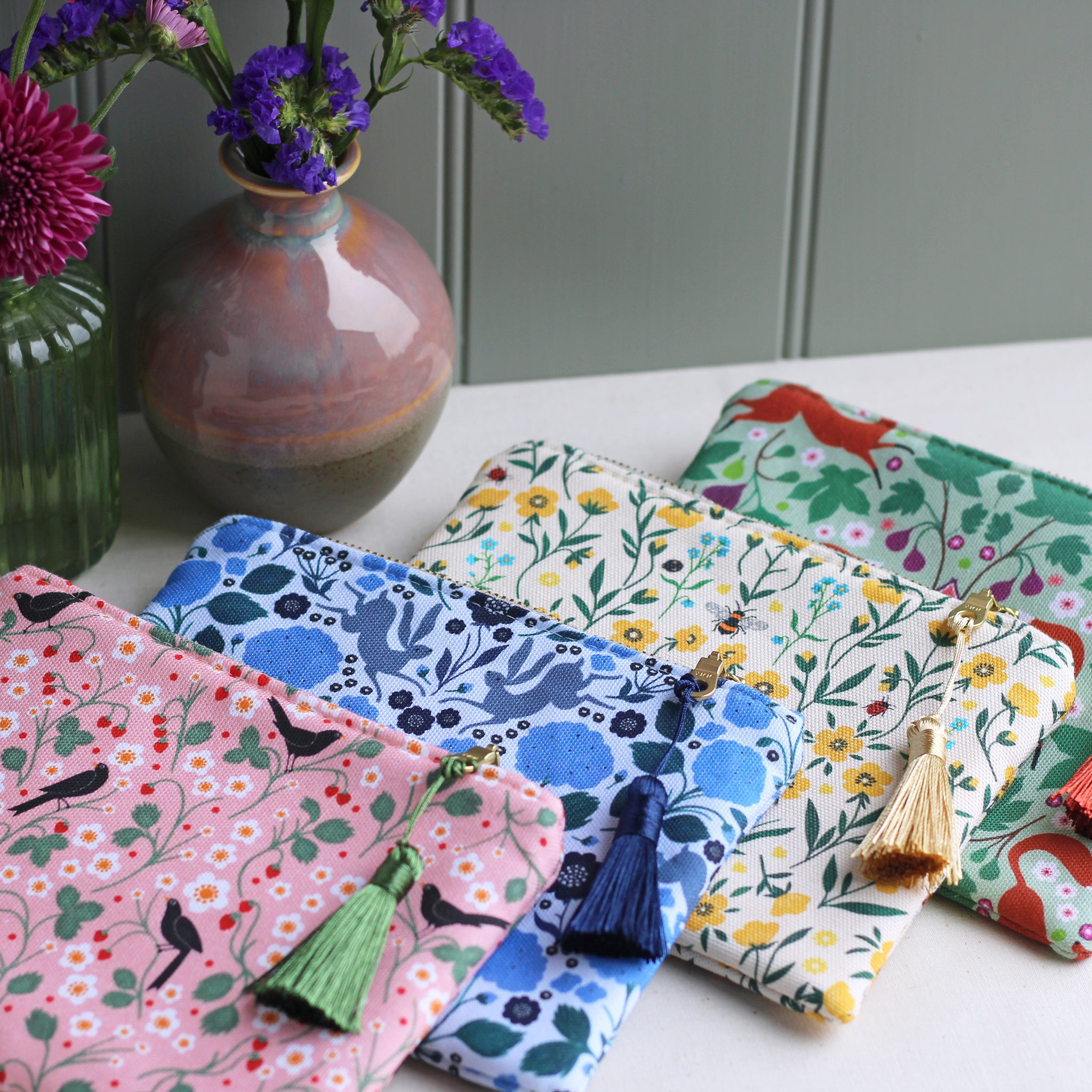 Outer fabric is 100% printed half panama cotton with a contrasting forest green poly-cotton lining. Each pouch is finished with a silky tassel and sturdy metal YKK zip — a perfect blend of practicality and refined charm.