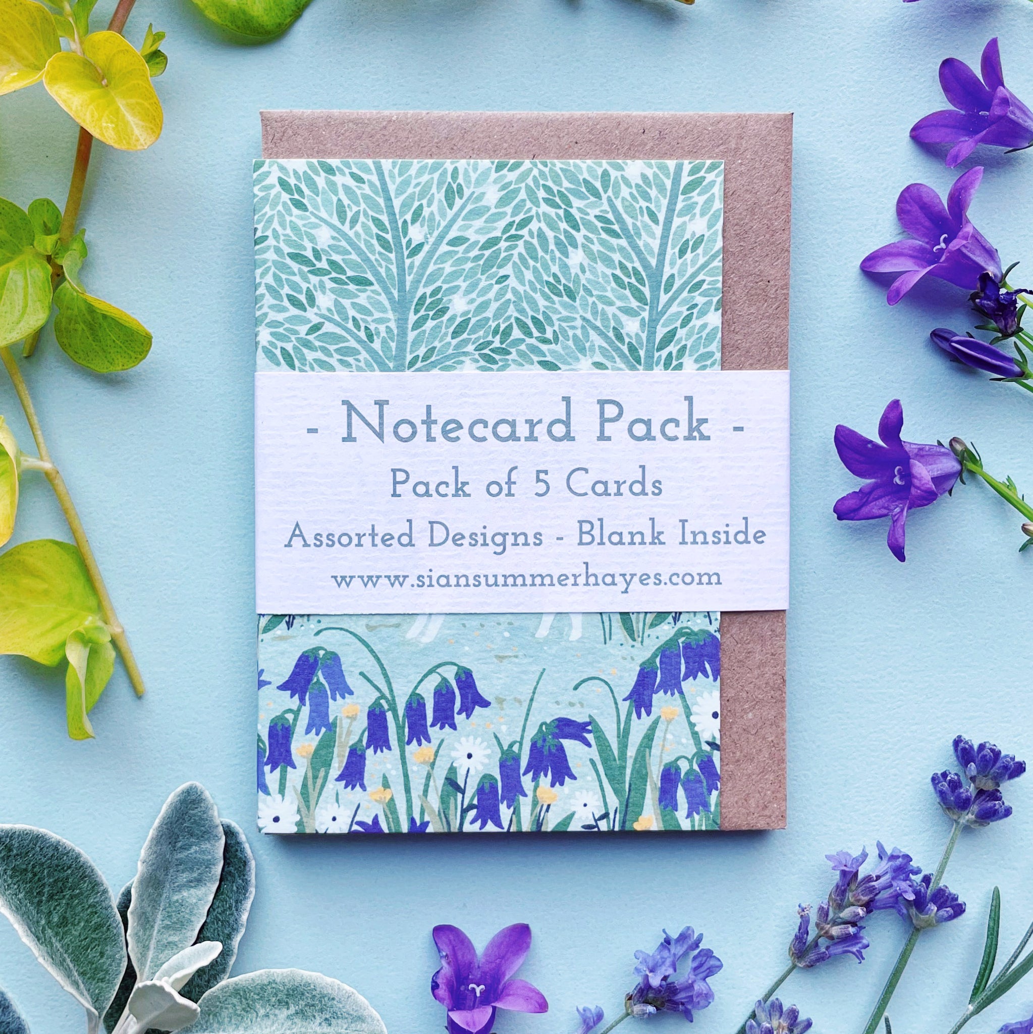 A set of five small notecards featuring original, meadow-inspired designs. Capturing the gentle charm of wild foliage, woodland edges, grazing horses and countryside walks with dogs, each card is blank inside and perfect for thoughtful notes, gift tags, or everyday messages.