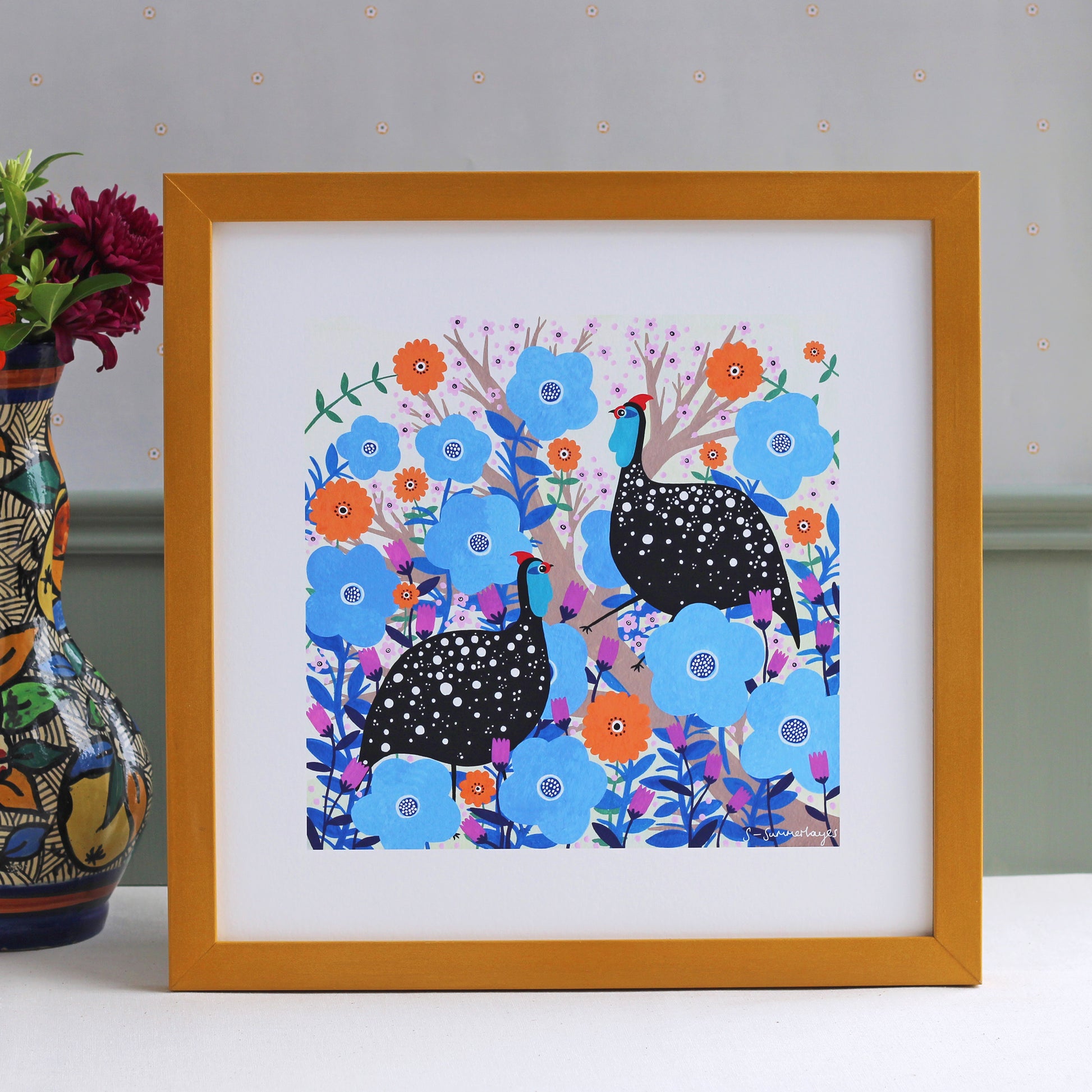Museum-quality giclée print taken from my original gouache painting. Featuring two guinea fowl perched among foliage and woodland. This quirky piece is stylish and colourful and works perfectly to add a bit of uniqueness to your everyday space.